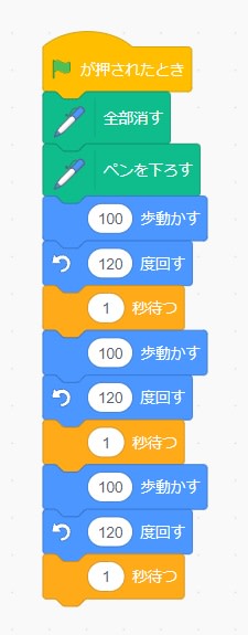 今回はスプライト(ネコ)に順次処理で正三角形を作成してもらうプログラムを作ってみました。